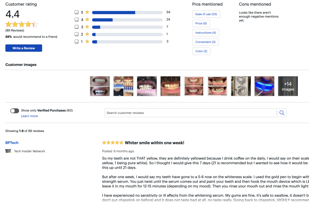 With over 3 years in operation, Snow has garnered thousands of 5-star reviews among websites like Google, Amazon, and even Best Buy. Amazon currently reports Snow at 4.3 stars out of 5 from over 1300+ reviews. Most users commonly mention that they experience zero pain or sensitivity compared to competitor products or strips. Customers also mention the amount of whitening serum that comes with their whitening kit. Snow includes 6-months of whitening serum, which can be considered significant in the category.